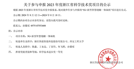 根據(jù) 2023 年度浙江省科學技術(shù)獎申報要求,現(xiàn)對我單位參與申報的“5G+新型智慧縫翻一體襪機”項目進行公式。